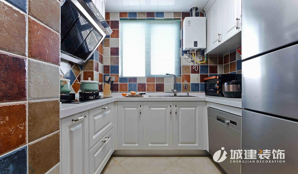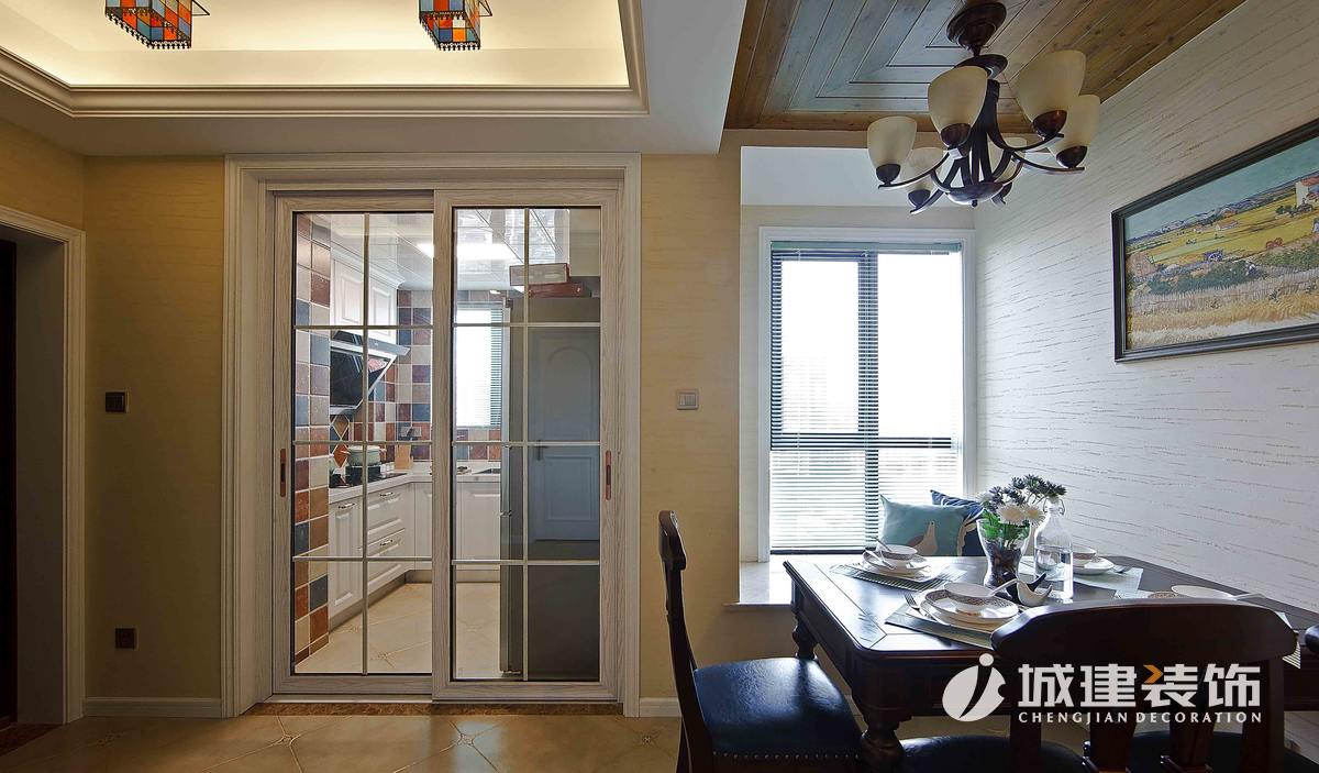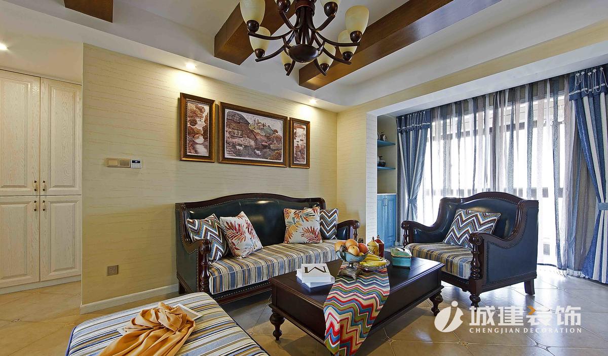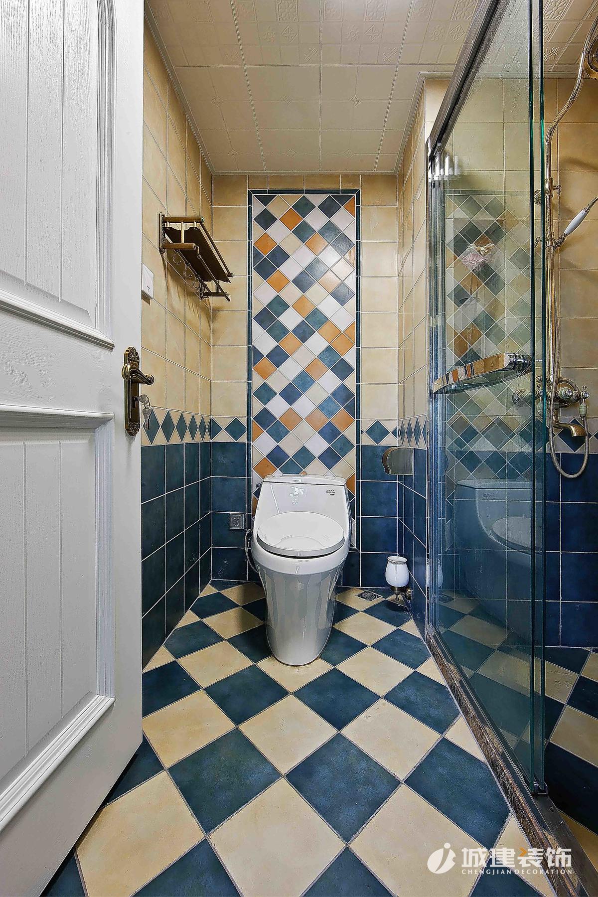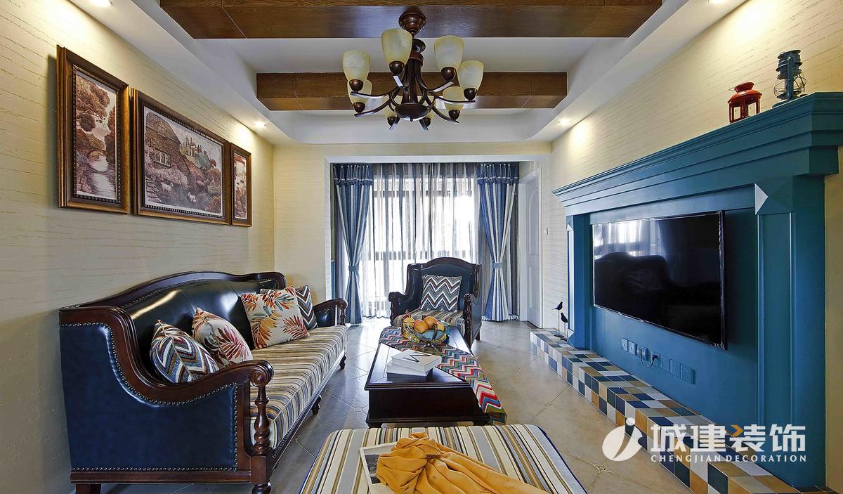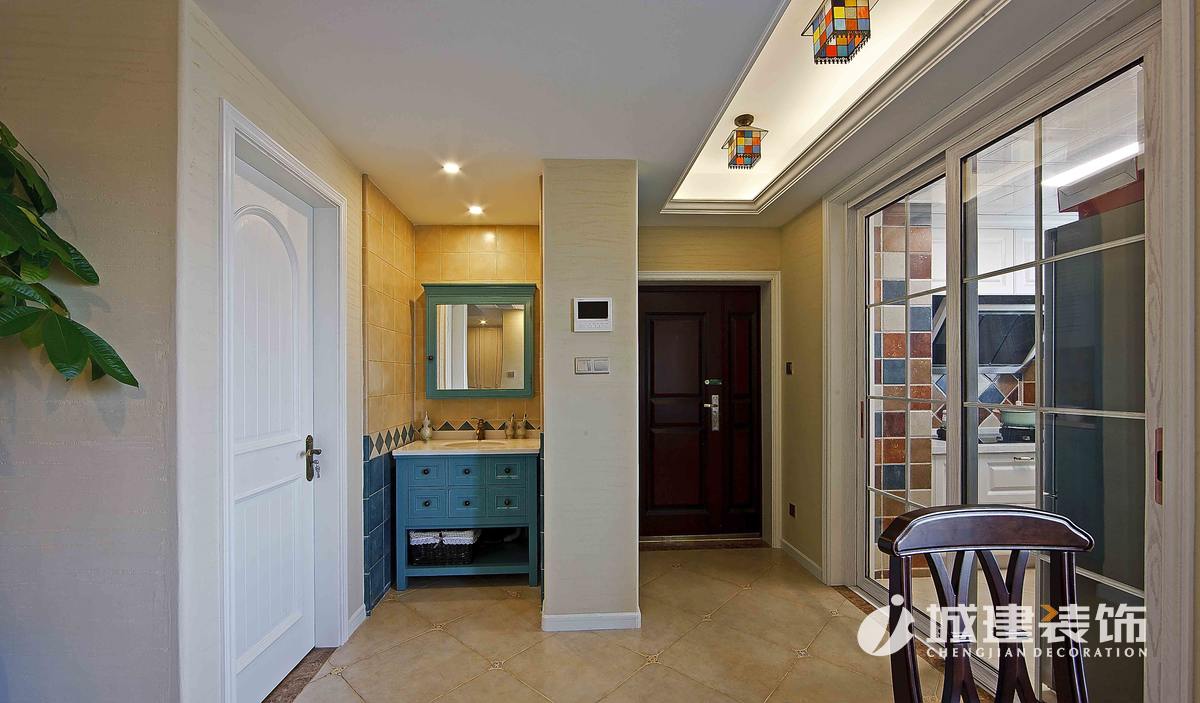 軟裝上色彩上以藍(lán)色為主,用了一些跳色來(lái)增加空間的靈動(dòng)感,材質(zhì)上選擇了皮木結(jié)合的家具多了一份沉穩(wěn)。燈具上選用了一些琉璃和古銅材質(zhì)的燈具,窗簾配色上還是以主色調(diào)藍(lán)色為主,淺色沙多了一分飄逸??蛷d地面的地磚以及衛(wèi)生間廚房仿古磚運(yùn)用了藍(lán)色與橙色撞色,在明亮的純色和強(qiáng)烈的撞色中,迸發(fā)出意想不到的魅力和效果。